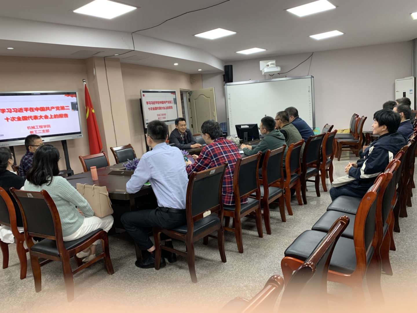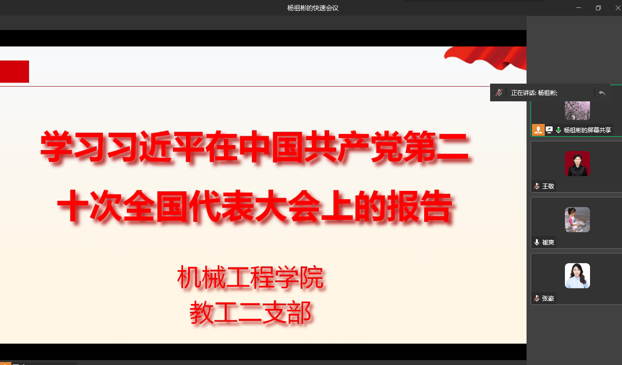 2022年11月4日,太阳成集团tyc151cc教工第二党支部在慧智楼90708会议室召开了支部会议,专题学习党的二十大报告。本次会议采用线上线下相结合的方式,会议现场由支部党员、公司副经理杨祖彬同志主持,支部全体党员参加学习。