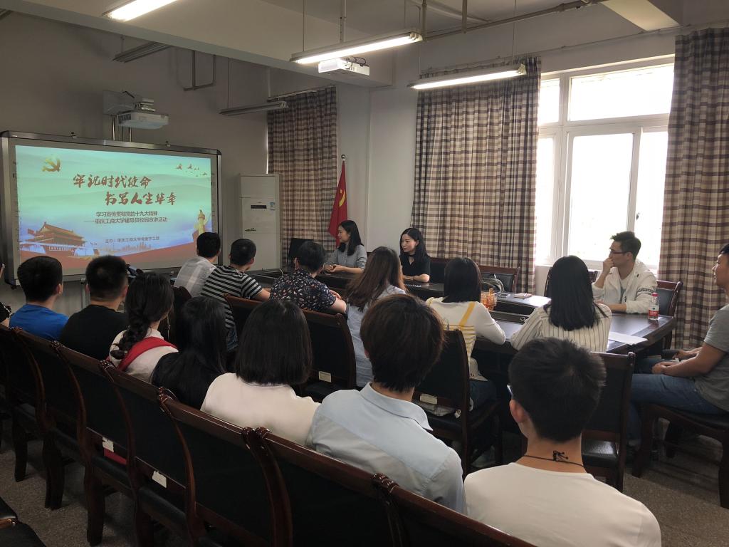 4月19日中午,根据集团的统一部署,太阳成集团tyc151cc优秀辅导员学习贯彻党的十九大精神宣讲会在慧智楼90711举行。辅导员向巧、袁娅婷分别作了宣讲报告,围绕如何准确深入地学习领会党的十九大精神作了全面系统的阐述。公司员工二支部全体党员聆听了两场精彩的报告。