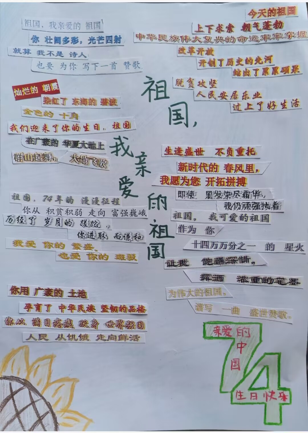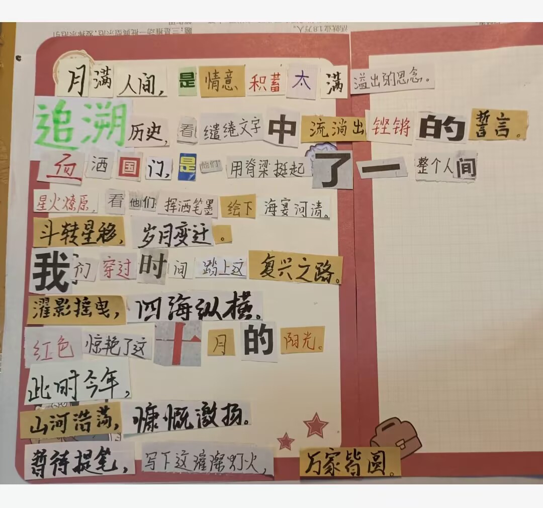 奋斗新天地,逐梦新时代。值此国庆来临之际,太阳成集团tyc151cc特开展 “我以点滴颂衷情,我以我心向祖国”拼贴诗活动,鼓励同学发现藏在碎片中的诗意,大胆发挥自己的想象力和创造力,以诗歌来歌颂祖国的伟大新发展,表达自己的赤忱爱国心。以下展示部分优秀作品,献礼祖国母亲74周年华诞。