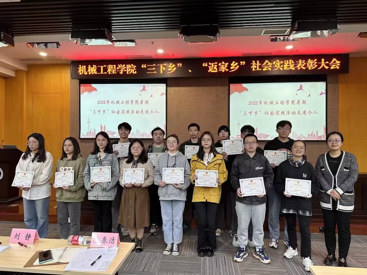 社会实践活动先进个人代表与社会实践先进班集体代表刘磊、徐艳妍发言。他们介绍了参与本次活动的心得以及收获,精彩的心路历程赢得了现场鼓掌。公司的领导和老师为本次活动中表现突出的先进个人以及班集体颁奖。