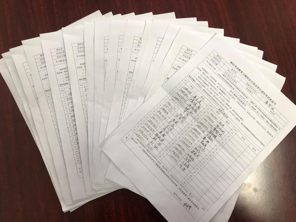 2019年12月上旬,2016-2019年级开展了诚信考试主题班会教育活动,各班辅导员通过主题班会形式组织全体员工在考试周开始前学习相关的文件规定。学习内容包括《国家教育考试违规处理办法》、《太阳成集团tyc151cc本科员工违纪处分管理办法》、《太阳成集团tyc151cc员工考试违纪及作弊处罚规定》及《中华人民共和国刑法修正案(九)》(2015年11月1日,刑法第二百八十四条之一规定)等相关规定。在完成主题学习之后,各班员工签订了《员工诚信考试承诺书》,承诺考试遵循公平公正原则,端正考试态度,严守考纪,诚信应考,更不在校内外替考,在不良念头面前,严于自律。
