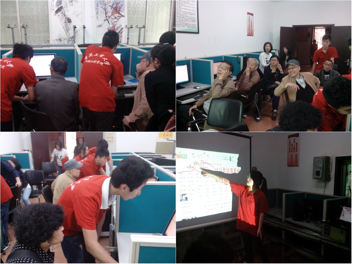 活动开始,志愿者以幻灯片的形式向老人讲诉了如何对电脑进行简单的操作。同学们认真细致的讲解,台下的老人们目不转睛地看着幻灯片,不时发出疑问。然后,小组组员贴心地来到每一个老人身边进行“手把手”辅导,教他们怎样看新闻、看电影等等。志愿者们耐心详细地讲解着,老人们兴致勃勃地操作着,大家脸上都洋溢着灿烂的笑脸,画面非常的温馨。接下来,志愿者们还对居住在该社区的老人们进行了关于生活状况和经济条件的调查问卷,卷面显示大部分老人都有着独立的经济来源,并且生活幸福。