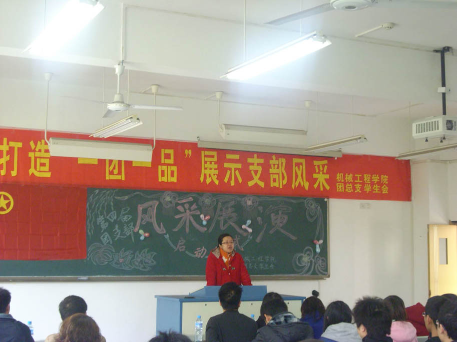 团总支书记刘静老师首先为这次活动致辞,就往届比赛向同学们做了介绍,提出了对同学们的要求与期望,鼓励大家在比赛中积极响应,充分展示自己的才华。组织部部长曹瑞介绍了风采展演大赛的活动流程及评分细节,并要求各支部准备好活动材料,借此平台加强班级的建设,激发同学活力,尤其是加大宣传力度,展现班级个性,增强创新意识。最后,09级辅导员张春媚老师对这次活动作了总结,希望各支部团结一致,不仅仅展示个人风采,更要共同创造一个富有活力、勇于创新的团支部。