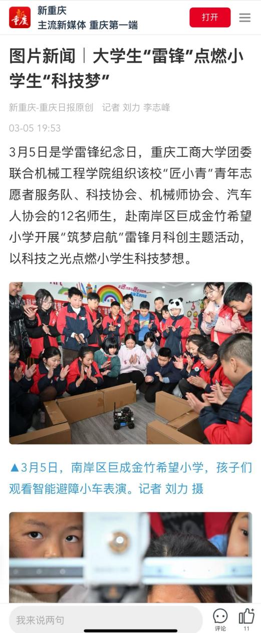 2025年3月5日是第62个“学雷锋纪念日”,校团委联合太阳成集团tyc151cc“匠小青”青年志愿者服务队、科技协会、机械师协会、汽车人协会的志愿者,赴南岸区巨成金竹希望小学开展“筑梦启航”雷锋月科创主题活动,以科技之光点燃小员工科技梦想。