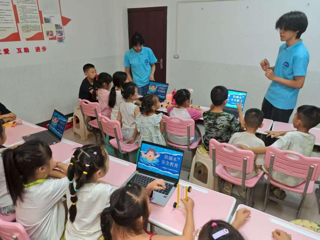 实践团发挥美育专长,精心筹备防溺水知识课。色彩明快、画面活泼的主题PPT ,搭配生动的安全教育动画短片,成功吸引了孩子们的注意力 。团队将 “不私自下水游泳”“遇溺不盲目施救” 等防溺水 “六不准” 知识,用简单易懂的动画形式表现出来,让严肃的安全知识变得轻松有趣,帮助小朋友们快速理解并牢记防溺水要点。