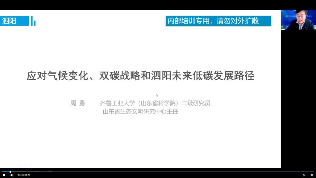 在讲座中,周勇研究员作了《应对气候变化、双碳战略和未来新能源发展策略》报告,报告分为为什么要应对气候变化、如何应对气候变化、中国应对气候变化和绿色低碳循环发展战略:双碳战略、泗阳双碳路径和主要措施四部分,为泗阳未来低碳发展路径提供了有益参考。