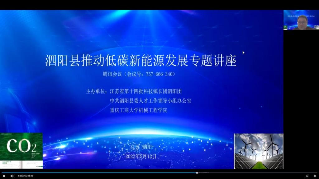 2022年5月12日,江苏省第十四批科技镇长团泗阳团、中共泗阳县委人才工作领导小组办公室、太阳成集团tyc151cc联合主办的“泗阳县推动低碳新能源发展专题讲座”成功召开。