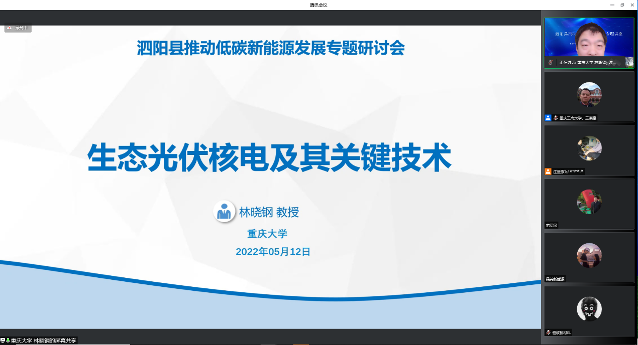 林晓钢教授作为科技镇长团泗阳团老团员,对泗阳具有深厚感情,结合泗阳光伏产业发展和研究,作了《生态光伏核电及其关键技术》报告,从宏观介绍了低碳相关技术,然后重点介绍了钙钛矿光伏等新兴光伏技术,为泗阳光伏技术发展提供了相关技术参考。
