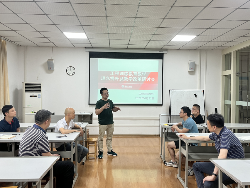 为全面提升人才培养水平,深化实践教学改革,以工程认证育人体系为蓝本,更好地开展工程训练课程,提高实践教学质量,2022年6月22日,在中心三楼设计教室召开了本学期工程训练教学总结暨实践教学改革交流研讨会,中心全体教师和机械设计制造及其自动化系主任谢俊博士、机械电子工程系主任陈鹏教授、智能车辆工程系主任杨智宇博士参加了研讨会。会议由工程训练中心主任夏洪均主持。