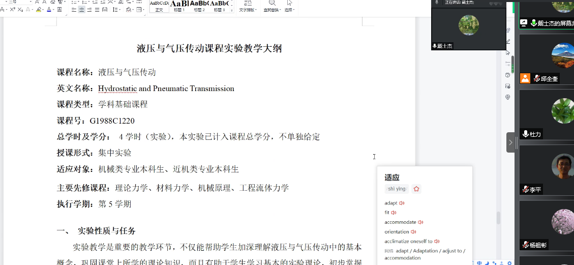 戴士杰教授首先在报告中对公司2021版专业认证的专家反馈意见进行了解读和分析,指出以后申请的注意事项。通过《液压与气压传动》、《工程图学Ⅰ》、《先进制造技术》、《汽车工程学A》等课程的教学大纲案例,说明了教学大纲中怎样融合课程思政元素,课程目标如何支撑毕业要求。