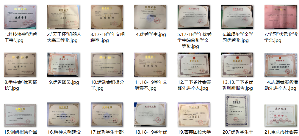在校期间,被评为重庆市优秀员工干部、社会实践优秀个人;获得两次员工综合一等奖学金、单项奖学金学习优秀奖、学习状元奖学金、优秀员工干部奖学金;校级优秀团干部、优秀团员、优秀员工、优秀员工干部、菁英团校老员工骨干培训优秀学员、三下乡社会实践先进个人、精神文明建设先进个人、志愿者服务活动先进个人、员工会优秀部长、科技协会优秀干事、校运动会积极分子等称号;在校期间还积极参加各种校园活动,曾获得“天工杯”机器人大赛二等奖、“奋斗的青春最美丽”2019暑期“三下乡”社会实践调研报告作品大赛二等奖、三下乡优秀调研报告、职场精英挑战赛全能精英奖。